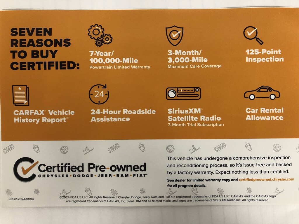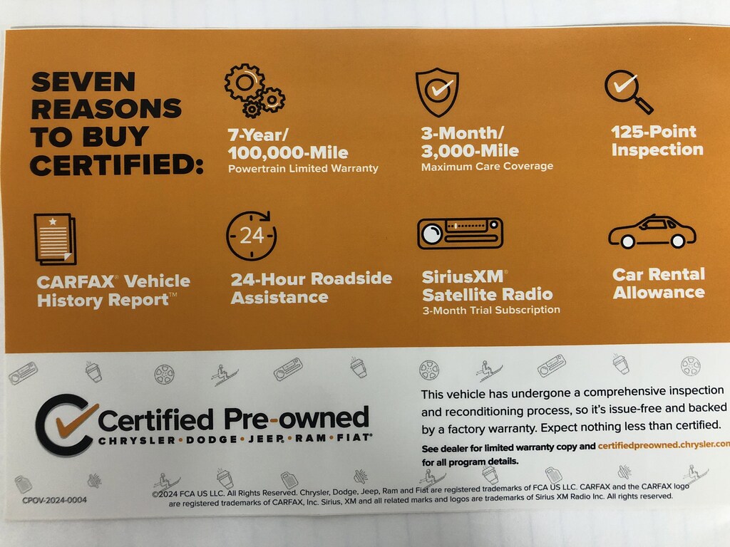 CERTIFIED PRE-OWNED!!! The vehicle underwent a 125-Point Inspection/Reconditioning process and comes with a 7-Year/100K mile factory powertrain warranty, along with a 3-month/3K mile factory Maximum Care Warranty! (If the vehicle is still under the original factory 3-year/36K mile warranty, that would run concurrent with the 3-mo/3K mile warranty). Also included at no extra cost is 24 Hour Roadside Assistance, Car Rental Allowance, and a 3-month SiriusXM Satellite Radio trial.