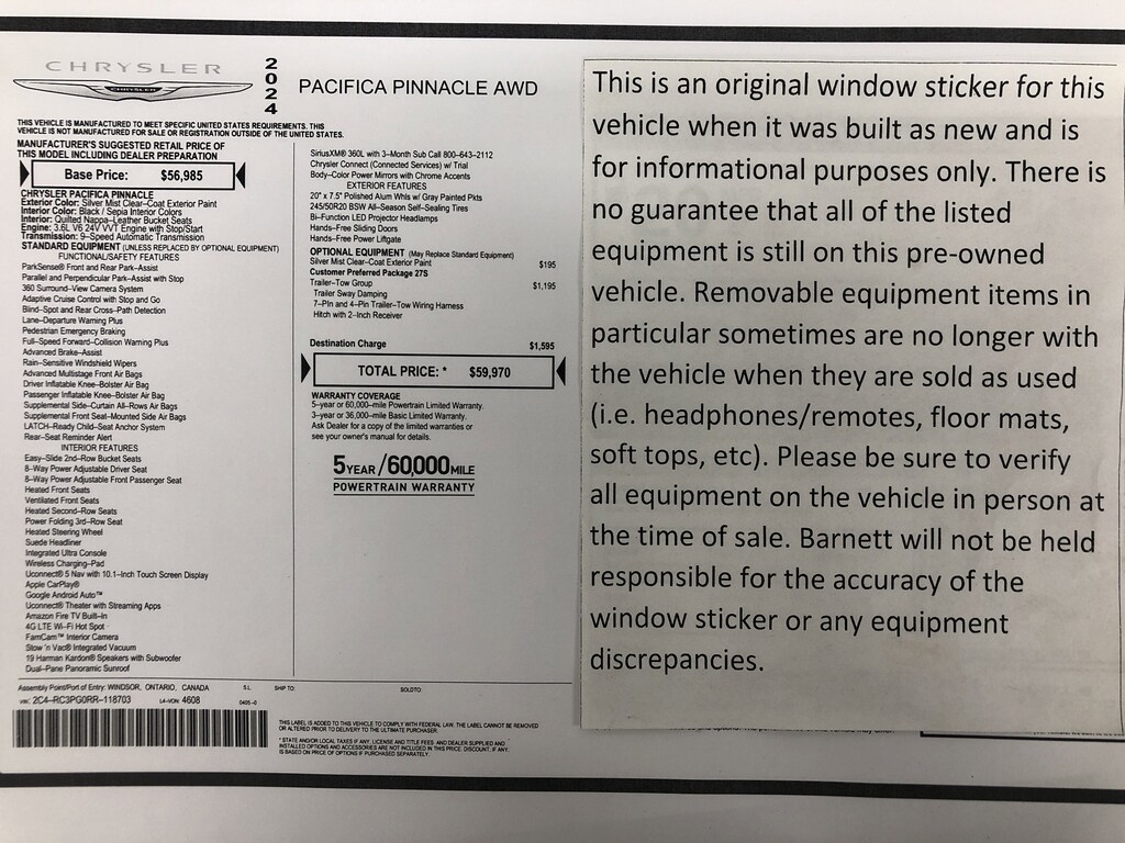 "The vehicle equipment list is auto generated and errors in listed equipment may occur. Please be sure to verify all equipment on the vehicle in person at time of sale as this list may not be 100% accurate. Barnett will not be held responsible for the accuracy of this list."