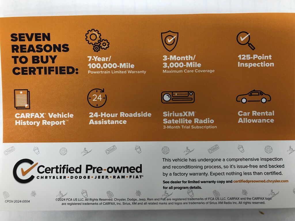 NEW TIRES INCLUDINED. CERTIFIED PRE-OWNED!!! The vehicle underwent a 125-Point Inspection/Reconditioning process and comes with a 7-Year/100K mile factory powertrain warranty, along with a 3-month/3K mile factory Maximum Care Warranty! (If the vehicle is still under the original factory 3-year/36K mile warranty, that would run concurrent with the 3-mo/3K mile warranty). Also included at no extra cost is 24 Hour Roadside Assistance, Car Rental Allowance, and a 3-month SiriusXM Satellite Radio trial.