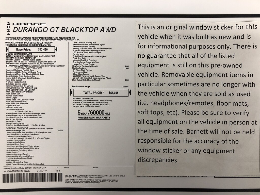 "The vehicle equipment list is auto generated and errors in listed equipment may occur. Please be sure to verify all equipment on the vehicle in person at time of sale as this list may not be 100% accurate. Barnett will not be held responsible for the accuracy of this list."