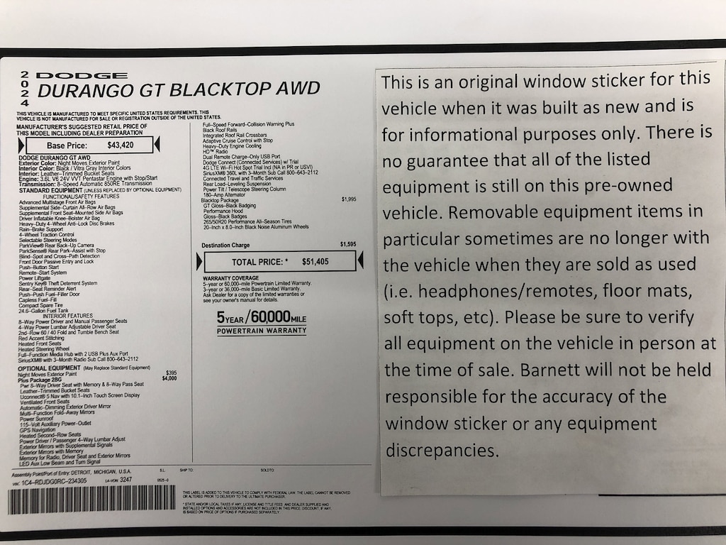 "The vehicle equipment list is auto generated and errors in listed equipment may occur. Please be sure to verify all equipment on the vehicle in person at time of sale as this list may not be 100% accurate. Barnett will not be held responsible for the accuracy of this list."