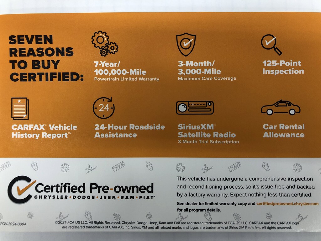 CERTIFIED PRE-OWNED!!! The vehicle underwent a 125-Point Inspection/Reconditioning process and comes with a 7-Year/100K mile factory powertrain warranty, along with a 3-month/3K mile factory Maximum Care Warranty! (If the vehicle is still under the original factory 3-year/36K mile warranty, that would run concurrent with the 3-mo/3K mile warranty). Also included at no extra cost is 24 Hour Roadside Assistance, Car Rental Allowance, and a 3-month SiriusXM Satellite Radio trial.