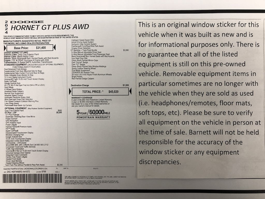 - GT BLACKTOP + TRACK PACK BUNDLE -inc: Remote Start System Michelin Brand Tires Heated Front Seats Bright Pedals Dual Mode Suspension Steel Door Sills Gloss Black Painted Day Light Opening Red Brake Calipers Heated Steering Wheel Tires: 235/40R20 All Season Dark Hornet Badge Sporty Leather Steering Wheel Dark GT Badge Wheels: 20" x 8" Abyss Finish Aluminum Gloss Black Painted Mirror Caps