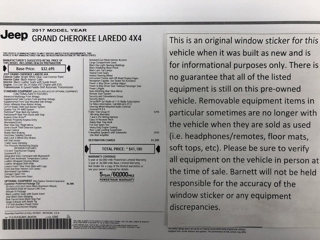 Listed selling price includes a $1000 Barnett Trade Bonus. Trade-in vehicles no more than 10 years old and 100K miles or less with a clean title automatically qualify. Trade-in vehicles outside these parameters need to be discussed and reviewed in person with the dealership to determine qualification. "The vehicle equipment list is auto generated and errors in listed equipment may occur. Please be sure to verify all equipment on the vehicle in person at time of sale as this list may not be 100% accurate. Barnett will not be held responsible for the accuracy of this list."
