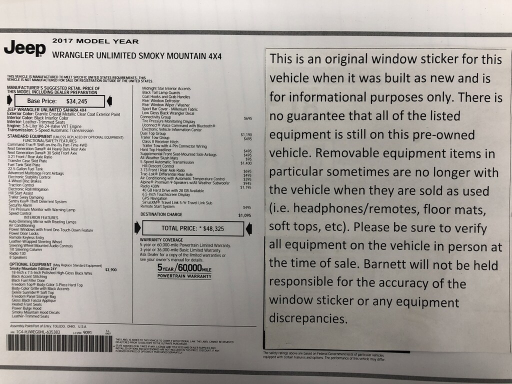 Used 2017 JeepWrangler JK Unlimited Smoky Mountain 4WD