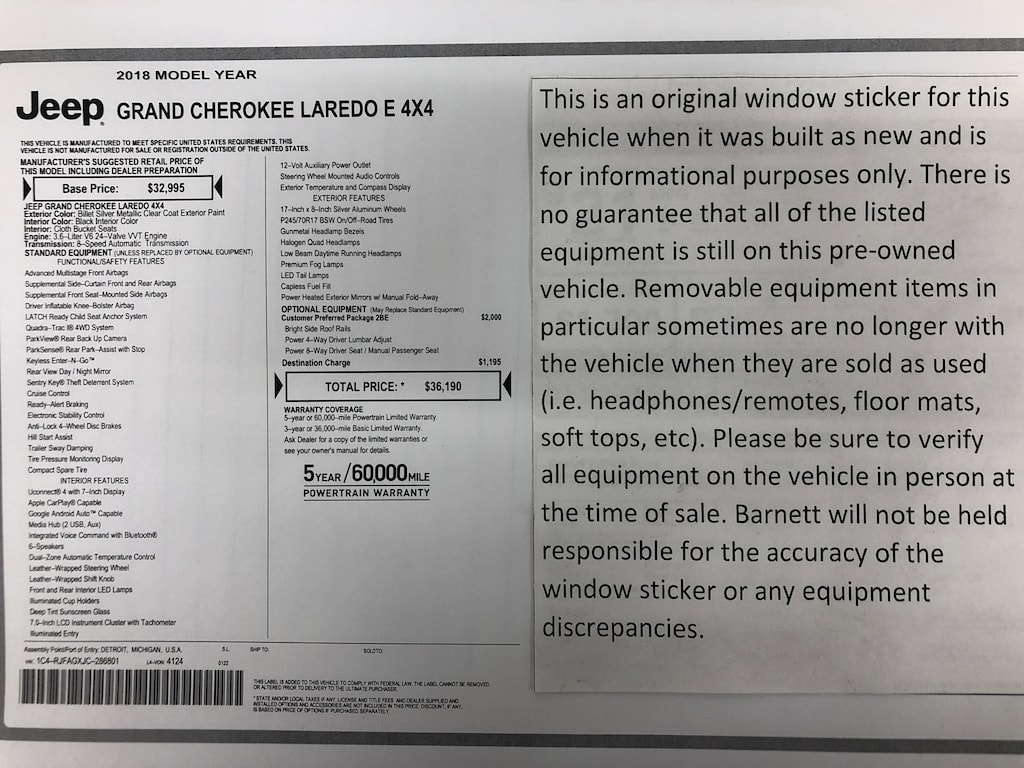 "The vehicle equipment list is auto generated and errors in listed equipment may occur. Please be sure to verify all equipment on the vehicle in person at time of sale as this list may not be 100% accurate. Barnett will not be held responsible for the accuracy of this list."