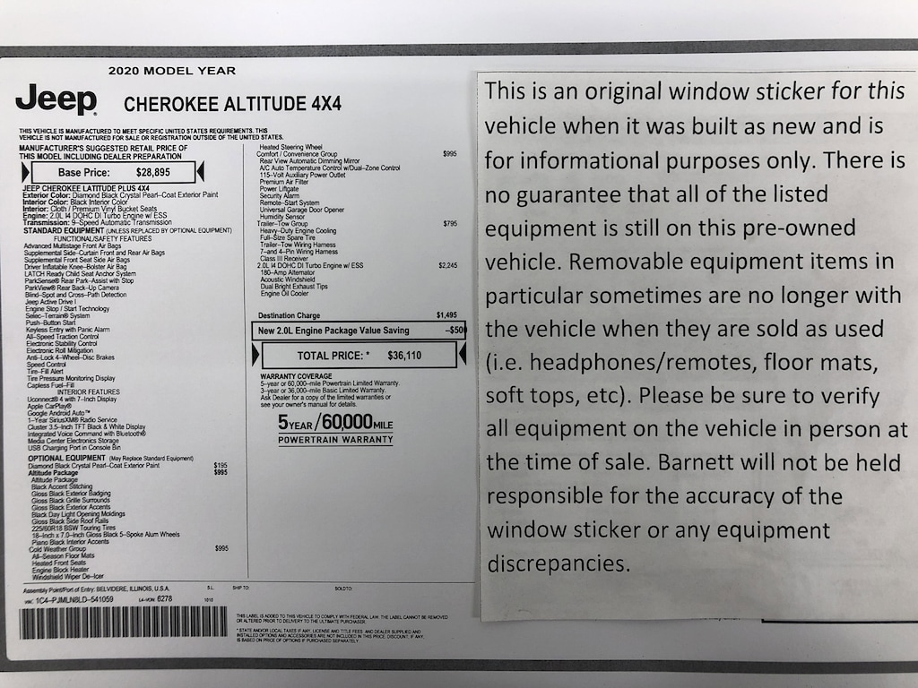 Listed selling price includes a $1000 Barnett Trade Bonus. Trade-in vehicles no more than 10 years old and 100K miles or less with a clean title automatically qualify. Trade-in vehicles outside these parameters need to be discussed and reviewed in person with the dealership to determine qualification. "The vehicle equipment list is auto generated and errors in listed equipment may occur. Please be sure to verify all equipment on the vehicle in person at time of sale as this list may not be 100% accurate. Barnett will not be held responsible for the accuracy of this list."