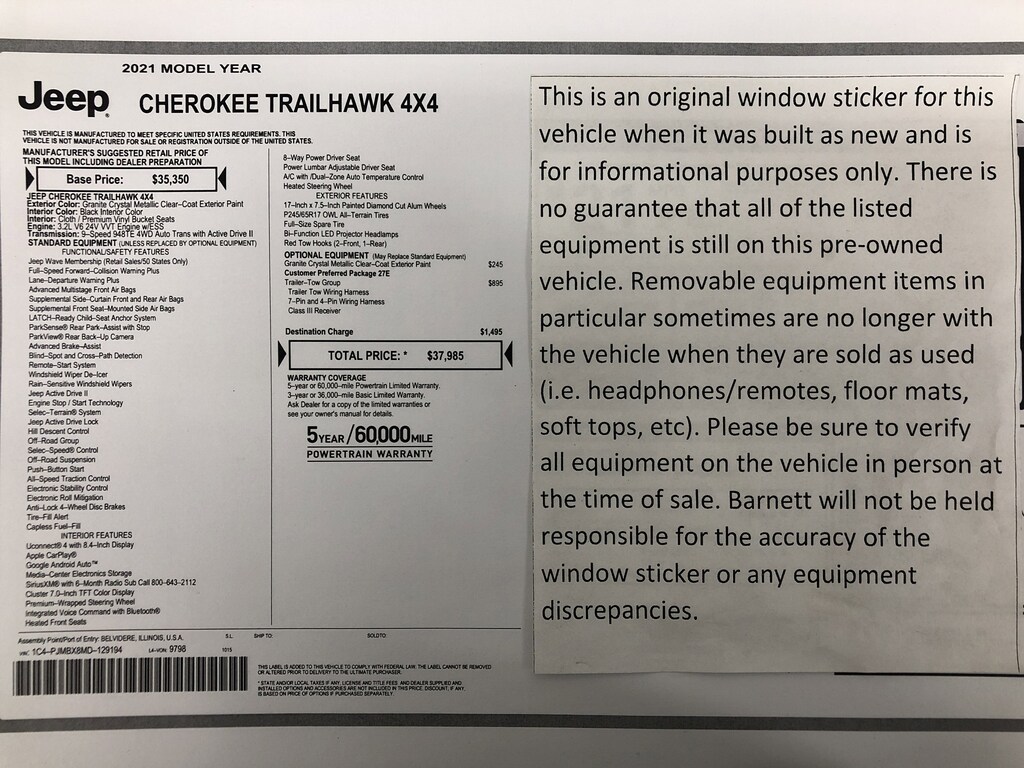 Listed selling price includes a $1000 Barnett Trade Bonus. Trade-in vehicles no more than 10 years old and 100K miles or less with a clean title automatically qualify. Trade-in vehicles outside these parameters need to be discussed and reviewed in person with the dealership to determine qualification. "The vehicle equipment list is auto generated and errors in listed equipment may occur. Please be sure to verify all equipment on the vehicle in person at time of sale as this list may not be 100% accurate. Barnett will not be held responsible for the accuracy of this list."