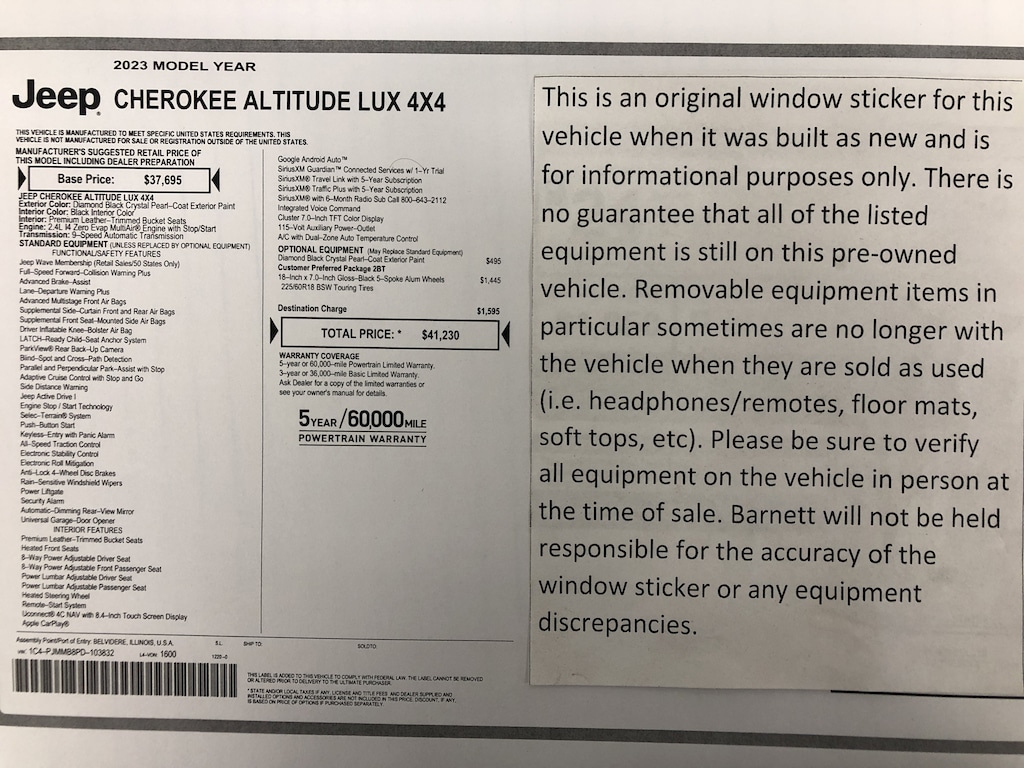 "The vehicle equipment list is auto generated and errors in listed equipment may occur. Please be sure to verify all equipment on the vehicle in person at time of sale as this list may not be 100% accurate. Barnett will not be held responsible for the accuracy of this list."