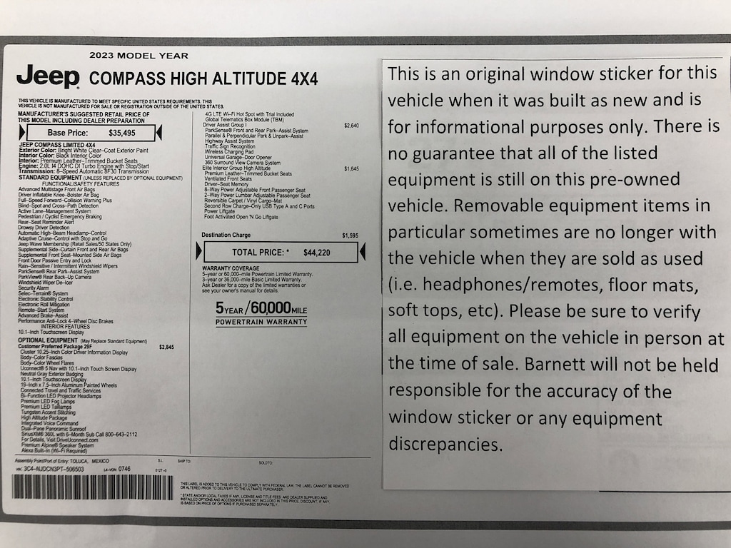 Listed selling price includes a $1000 Barnett Trade Bonus. Trade-in vehicles no more than 10 years old and 100K miles or less with a clean title automatically qualify. Trade-in vehicles outside these parameters need to be discussed and reviewed in person with the dealership to determine qualification. "The vehicle equipment list is auto generated and errors in listed equipment may occur. Please be sure to verify all equipment on the vehicle in person at time of sale as this list may not be 100% accurate. Barnett will not be held responsible for the accuracy of this list."