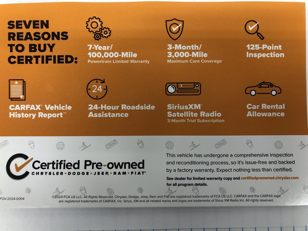 BRAND NEW TIRES! CERTIFIED PRE-OWNED!!! The vehicle underwent a 125-Point Inspection/Reconditioning process and comes with a 7-Year/100K mile factory powertrain warranty, along with a 3-month/3K mile factory Maximum Care Warranty! (If the vehicle is still under the original factory 3-year/36K mile warranty, that would run concurrent with the 3-mo/3K mile warranty). Also included at no extra cost is 24 Hour Roadside Assistance, Car Rental Allowance, and a 3-month SiriusXM Satellite Radio trial.