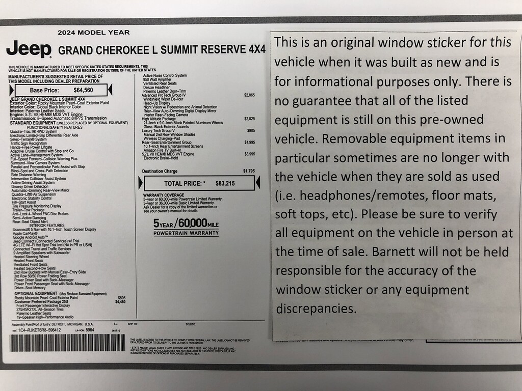 "The vehicle equipment list is auto generated and errors in listed equipment may occur. Please be sure to verify all equipment on the vehicle in person at time of sale as this list may not be 100% accurate. Barnett will not be held responsible for the accuracy of this list."Listed selling price includes a $1000 Barnett Trade Bonus. Trade-in vehicles no more than 10 years old and 100K miles or less with a clean title automatically qualify. Trade-in vehicles outside these parameters need to be discussed and reviewed in person with the dealership to determine qualification.