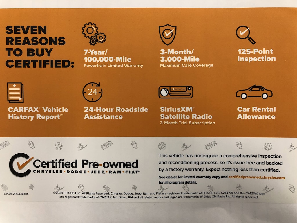 CERTIFIED PRE-OWNED!!! The vehicle underwent a 125-Point Inspection/Reconditioning process and comes with a 7-Year/100K mile factory powertrain warranty, along with a 3-month/3K mile factory Maximum Care Warranty! (If the vehicle is still under the original factory 3-year/36K mile warranty, that would run concurrent with the 3-mo/3K mile warranty). Also included at no extra cost is 24 Hour Roadside Assistance, Car Rental Allowance, and a 3-month SiriusXM Satellite Radio trial.