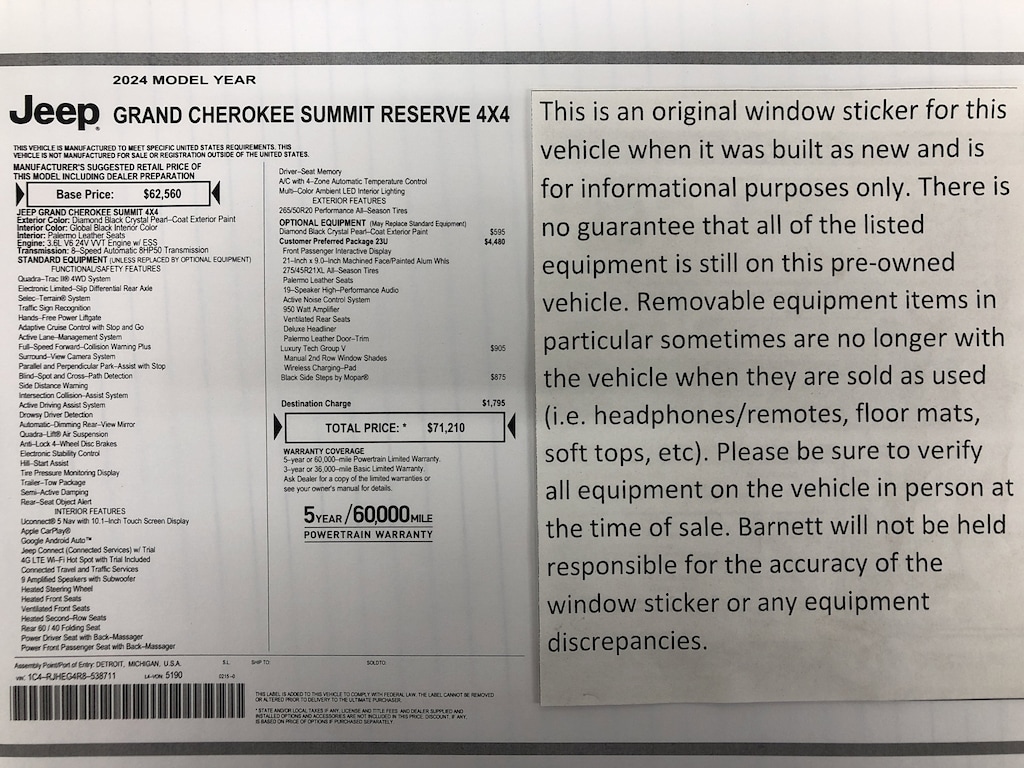 "The vehicle equipment list is auto generated and errors in listed equipment may occur. Please be sure to verify all equipment on the vehicle in person at time of sale as this list may not be 100% accurate. Barnett will not be held responsible for the accuracy of this list."