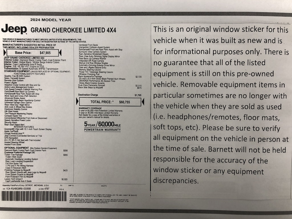 Listed selling price includes a $1000 Barnett Trade Bonus. Trade-in vehicles no more than 10 years old and 100K miles or less with a clean title automatically qualify. Trade-in vehicles outside these parameters need to be discussed and reviewed in person with the dealership to determine qualification. "The vehicle equipment list is auto generated and errors in listed equipment may occur. Please be sure to verify all equipment on the vehicle in person at time of sale as this list may not be 100% accurate. Barnett will not be held responsible for the accuracy of this list."