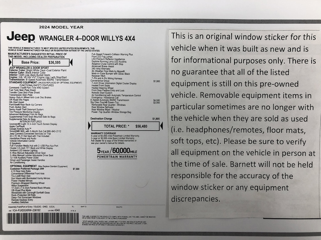 • QUICK ORDER PACKAGE 24W WILLYS -inc: Engine: 3.6L V6 24V VVT UPG I w/ESS Transmission: 8-Speed Automatic (850RE) Speed Sensitive Power Locks 7 & 4 Pin Wiring Harness Conventional Differential Front Axle 4-Wheel Drive Swing Gate Decal Black Grille Injection Molded Black Rear Bumper Dana M210 Wide HD Tube Front Axle Front 1-Touch Down Power Windows Daytime Running Lamps LED Accents Front LED Fog Lamps LED Premium Reflector Headlamps E-Locker Rear Axle Corning Gorilla Glass Security Alarm Willys Class II Receiver Hitch Mold In Color Bumper w/Gloss Black Advanced Brake Assist Automatic Headlamps Off-Road Plus Mode 240 Amp Alternator Willys Hood Decal Full Speed Forward Collision Warning Plus Rock Protection Sill Rails 97 MPH Vehicle Max Speed Calibration Power Heated Mirrors Enhanced Adaptive Cruise Control Auxiliary Switches Dana M220 Wide Rear Axle Molded in Color Rubicon Highline Flare Premium Wrapped Steering Wheel Sun Visors w/Illuminated Vanity Mirro