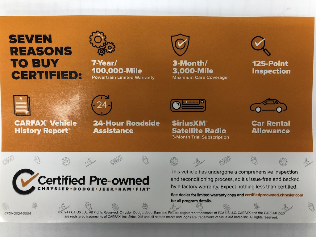 CERTIFIED PRE-OWNED!!! The vehicle underwent a 125-Point Inspection/Reconditioning process and comes with a 7-Year/100K mile factory powertrain warranty, along with a 3-month/3K mile factory Maximum Care Warranty! (If the vehicle is still under the original factory 3-year/36K mile warranty, that would run concurrent with the 3-mo/3K mile warranty). Also included at no extra cost is 24 Hour Roadside Assistance, Car Rental Allowance, and a 3-month SiriusXM Satellite Radio trial.