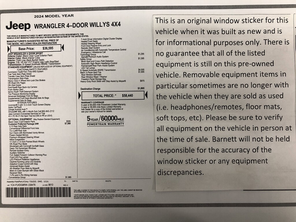- QUICK ORDER PACKAGE 24W WILLYS -inc: Engine: 3.6L V6 24V VVT UPG I w/ESS Transmission: 8-Speed Automatic (850RE) Speed Sensitive Power Locks 7 & 4 Pin Wiring Harness Conventional Differential Front Axle 4-Wheel Drive Swing Gate Decal Black Grille Injection Molded Black Rear Bumper Dana M210 Wide HD Tube Front Axle Front 1-Touch Down Power Windows Daytime Running Lamps LED Accents Front LED Fog Lamps LED Premium Reflector Headlamps E-Locker Rear Axle Corning Gorilla Glass Security Alarm Willys Class II Receiver Hitch Mold In Color Bumper w/Gloss Black Advanced Brake Assist Automatic Headlamps Off-Road Plus Mode 240 Amp Alternator Willys Hood Decal Full Speed Forward Collision Warning Plus Rock Protection Sill Rails 97 MPH Vehicle Max Speed Calibration Power Heated Mirrors Enhanced Adaptive Cruise Control Auxiliary Switches Dana M220 Wide Rear Axle Molded in Color Rubicon Highline Flare Premium Wrapped Steering Wheel Sun Visors w/Illuminated Vanity Mirro