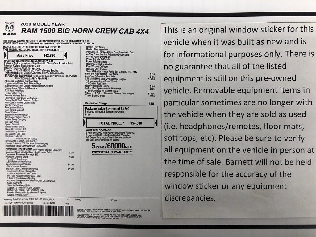 - QUICK ORDER PACKAGE 27Z BIG HORN -inc: Engine: 5.7L V8 HEMI MDS VVT eTorque Transmission: 8-Speed Automatic (8HP75) Big Horn Badge