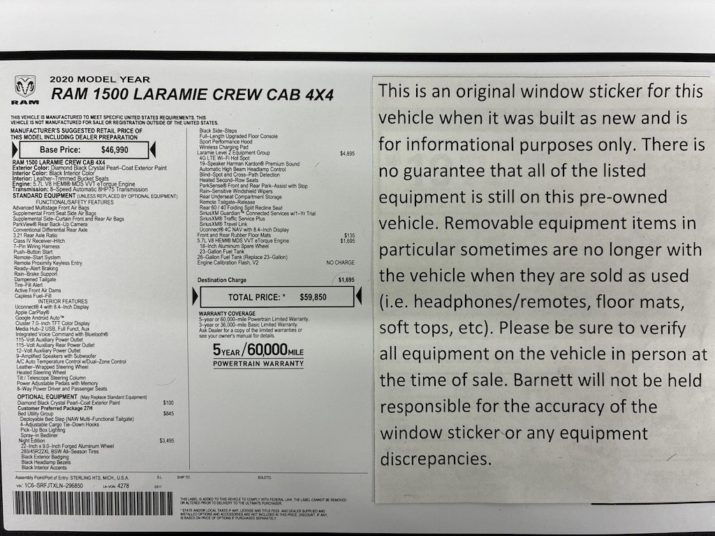 - LARAMIE LEVEL 2 EQUIPMENT GROUP -inc: Blind Spot & Cross Path Detection Rain Sensitive Windshield Wipers ParkSense Front/Rear Park Assist w/Stop Radio: Uconnect 4C Nav w/8.4" Display SiriusXM Traffic Plus Disassociated Touchscreen Display HD Radio For Details Visit DriveUconnect.com 1-Yr SiriusXM Guardian Trial 5-Year SiriusXM Travel Link Service GPS Navigation 5-Year SiriusXM Traffic Service SiriusXM Travel Link 4G LTE Wi-Fi Hot Spot Rear 60/40 Folding Split Recline Seat Remote Tailgate Release harman/kardon 19 Speaker Premium Sound Rear Underseat Compartment Storage Auto High Beam Headlamp Control Heated Second Row Seats Tailgate Ajar Warning Lamp Foam Bottle Insert (Door Trim Panel)