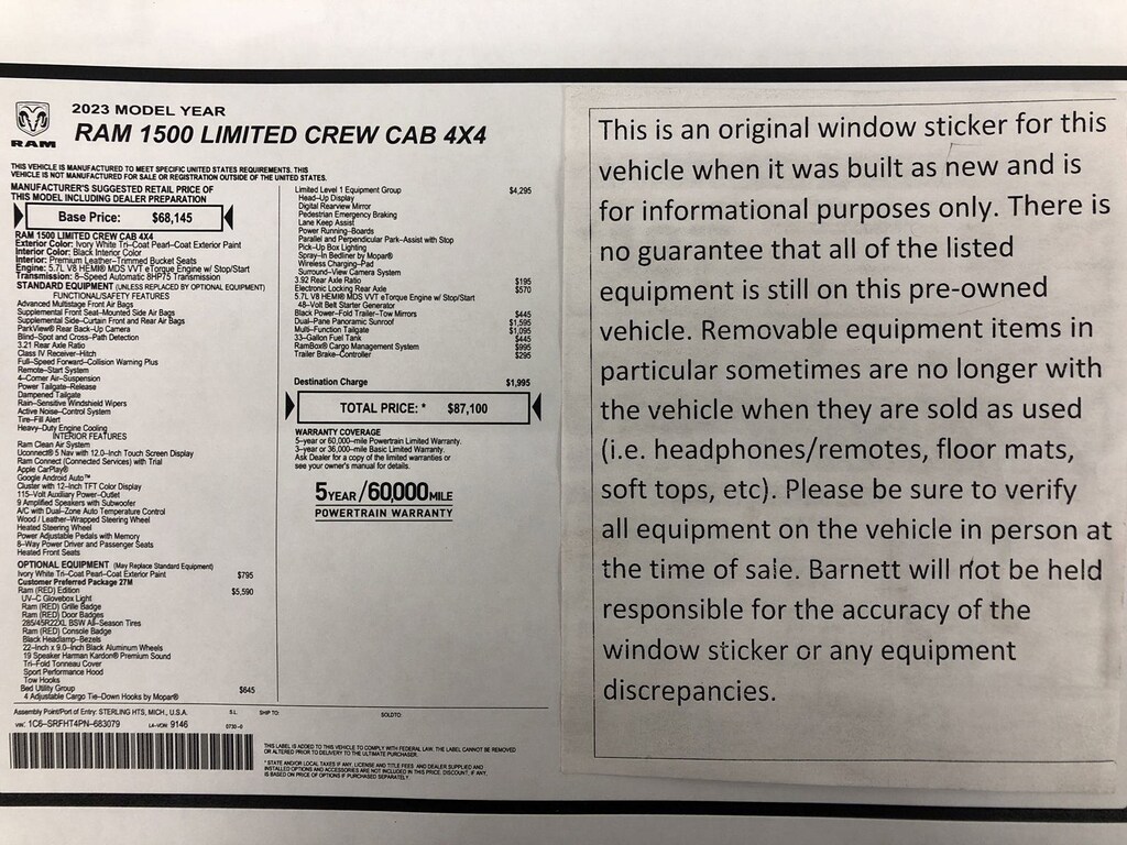 Listed selling price includes a $1000 Barnett Trade Bonus. Trade-in vehicles no more than 10 years old and 100K miles or less with a clean title automatically qualify. Trade-in vehicles outside these parameters need to be discussed and reviewed in person with the dealership to determine qualification. "The vehicle equipment list is auto generated and errors in listed equipment may occur. Please be sure to verify all equipment on the vehicle in person at time of sale as this list may not be 100% accurate. Barnett will not be held responsible for the accuracy of this list."