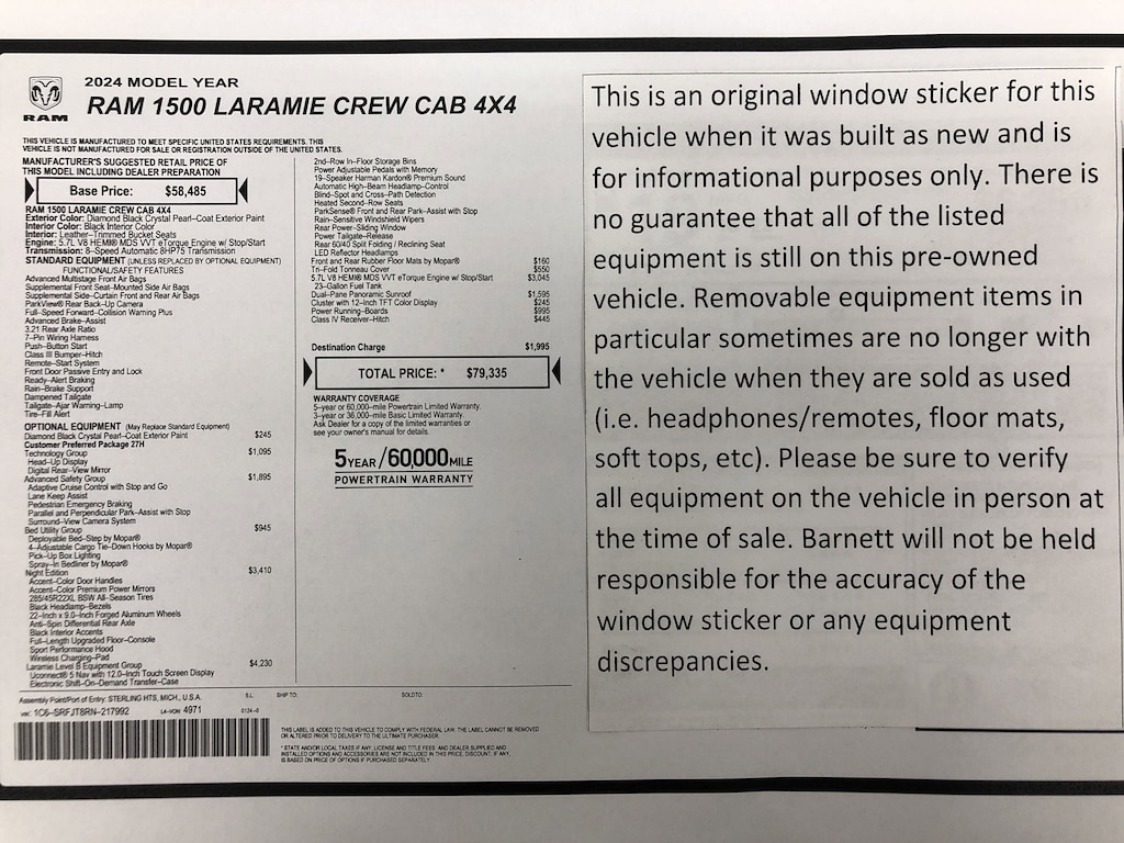 Listed selling price includes a $1000 Barnett Trade Bonus. Trade-in vehicles no more than 10 years old and 100K miles or less with a clean title automatically qualify. Trade-in vehicles outside these parameters need to be discussed and reviewed in person with the dealership to determine qualification. "The vehicle equipment list is auto generated and errors in listed equipment may occur. Please be sure to verify all equipment on the vehicle in person at time of sale as this list may not be 100% accurate. Barnett will not be held responsible for the accuracy of this list."