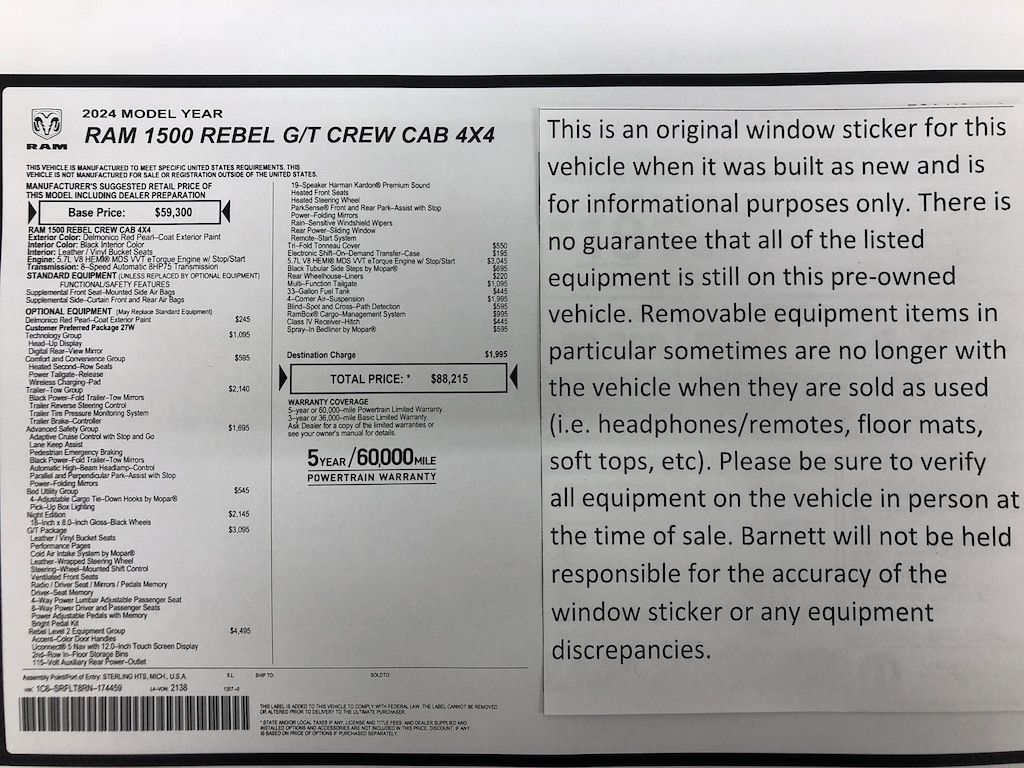 Listed selling price includes a $1000 Barnett Trade Bonus. Trade-in vehicles no more than 10 years old and 100K miles or less with a clean title automatically qualify. Trade-in vehicles outside these parameters need to be discussed and reviewed in person with the dealership to determine qualification. "The vehicle equipment list is auto generated and errors in listed equipment may occur. Please be sure to verify all equipment on the vehicle in person at time of sale as this list may not be 100% accurate. Barnett will not be held responsible for the accuracy of this list."