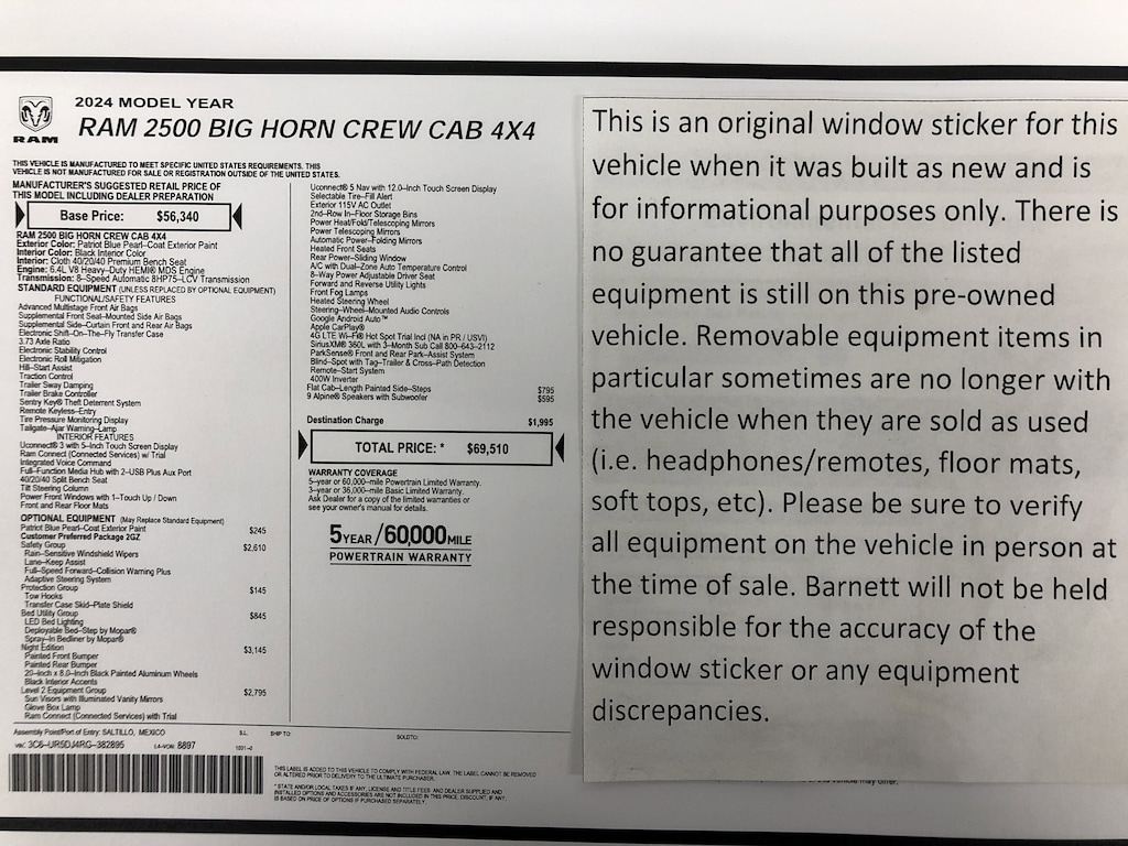 "The vehicle equipment list is auto generated and errors in listed equipment may occur. Please be sure to verify all equipment on the vehicle in person at time of sale as this list may not be 100% accurate. Barnett will not be held responsible for the accuracy of this list."