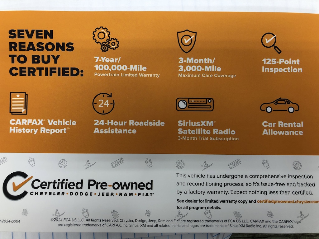 CERTIFIED PRE-OWNED!!! The vehicle underwent a 125-Point Inspection/Reconditioning process and comes with a 7-Year/100K mile factory powertrain warranty, along with a 3-month/3K mile factory Maximum Care Warranty! (If the vehicle is still under the original factory 3-year/36K mile warranty, that would run concurrent with the 3-mo/3K mile warranty). Also included at no extra cost is 24 Hour Roadside Assistance, Car Rental Allowance, and a 3-month SiriusXM Satellite Radio trial.