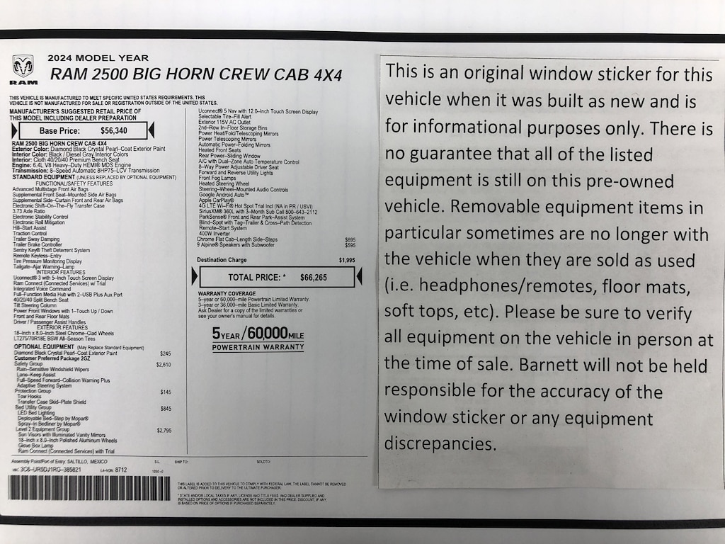 - LEVEL 2 EQUIPMENT GROUP -inc: Rear Window Defroster Blind Spot & Cross Path Detection LED Tail Lamps Power Adjustable Pedals Leather Wrapped Steering Wheel Rear Power Sliding Window Rear Dome w/On/Off Switch Lamp Front Fog Lamps Glove Box Lamp Auto Power-Folding Mirrors Footwell Courtesy Lamp Media Hub w/2 Charge Only USBs Heated Front Seats Mirror Running Lights Heated Steering Wheel Foam Bottle Insert (Door Trim Panel) Wheels: 18" x 8.0" Polished Aluminum Dampened Tailgate Security Alarm Big Horn IP Badge Power Adjustable Convex Aux Mirrors Forward & Reverse Utility Lights Locking Lower Glove Box Remote Start System Radio: Uconnect 5 Nav w/12.0" Display Google Android Auto Off-Road Information Pages Selectable Tire Fill Alert Trailer Tow Pages Disassociated Touchscreen Display HD Radio For Details Visit DriveUconnect.com For More Info Call 800-643-2112 12" Touchscreen Display Air Conditioning ATC w/Dual Zone Control GPS Navigation 4G LTE Wi-Fi H