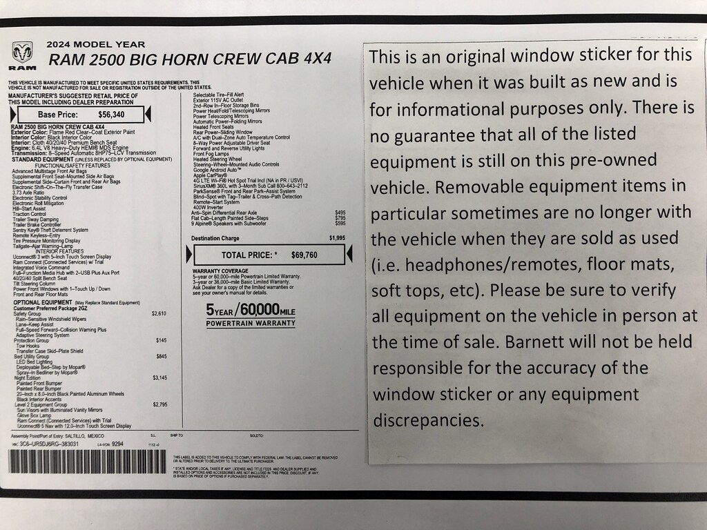 Listed selling price includes a $1000 Barnett Trade Bonus. Trade-in vehicles no more than 10 years old and 100K miles or less with a clean title automatically qualify. Trade-in vehicles outside these parameters need to be discussed and reviewed in person with the dealership to determine qualification. "The vehicle equipment list is auto generated and errors in listed equipment may occur. Please be sure to verify all equipment on the vehicle in person at time of sale as this list may not be 100% accurate. Barnett will not be held responsible for the accuracy of this list."