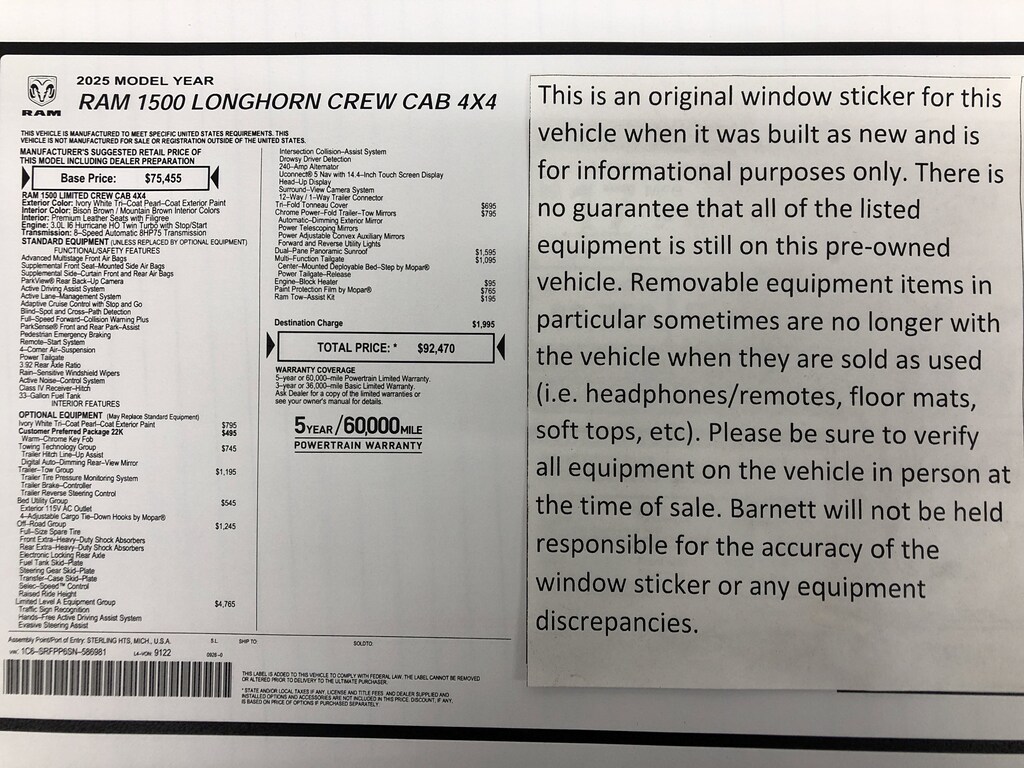 - LIMITED LEVEL A EQUIPMENT GROUP -inc: Surround View Camera System LED CHMSL Lamp For Details Visit DriveUconnect.com Tri-Fold Tonneau Cover Traffic Sign Recognition Hands-Free Active Driving Assist System Head Up Display Evasive Steer Assist Drowsy Driver Detection Intersection Collision Assist System Disassociated Touchscreen Display Smartphone As A Key Capable 14.4" Touchscreen Display Radio: Uconnect 5 Nav w/14.4" Display 240 Amp Alternator 12-Way/1-Way Trailer Connector