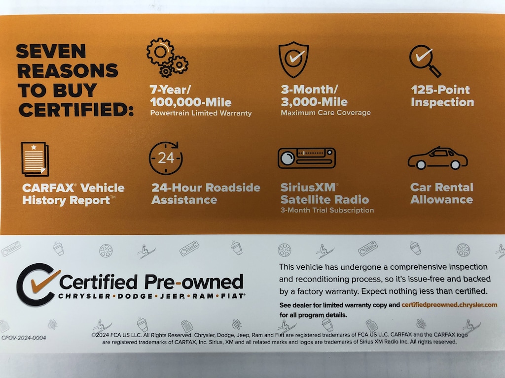CERTIFIED PRE-OWNED!!! The vehicle underwent a 125-Point Inspection/Reconditioning process and comes with a 7-Year/100K mile factory powertrain warranty, along with a 3-month/3K mile factory Maximum Care Warranty! (If the vehicle is still under the original factory 3-year/36K mile warranty, that would run concurrent with the 3-mo/3K mile warranty). Also included at no extra cost is 24 Hour Roadside Assistance, Car Rental Allowance, and a 3-month SiriusXM Satellite Radio trial.