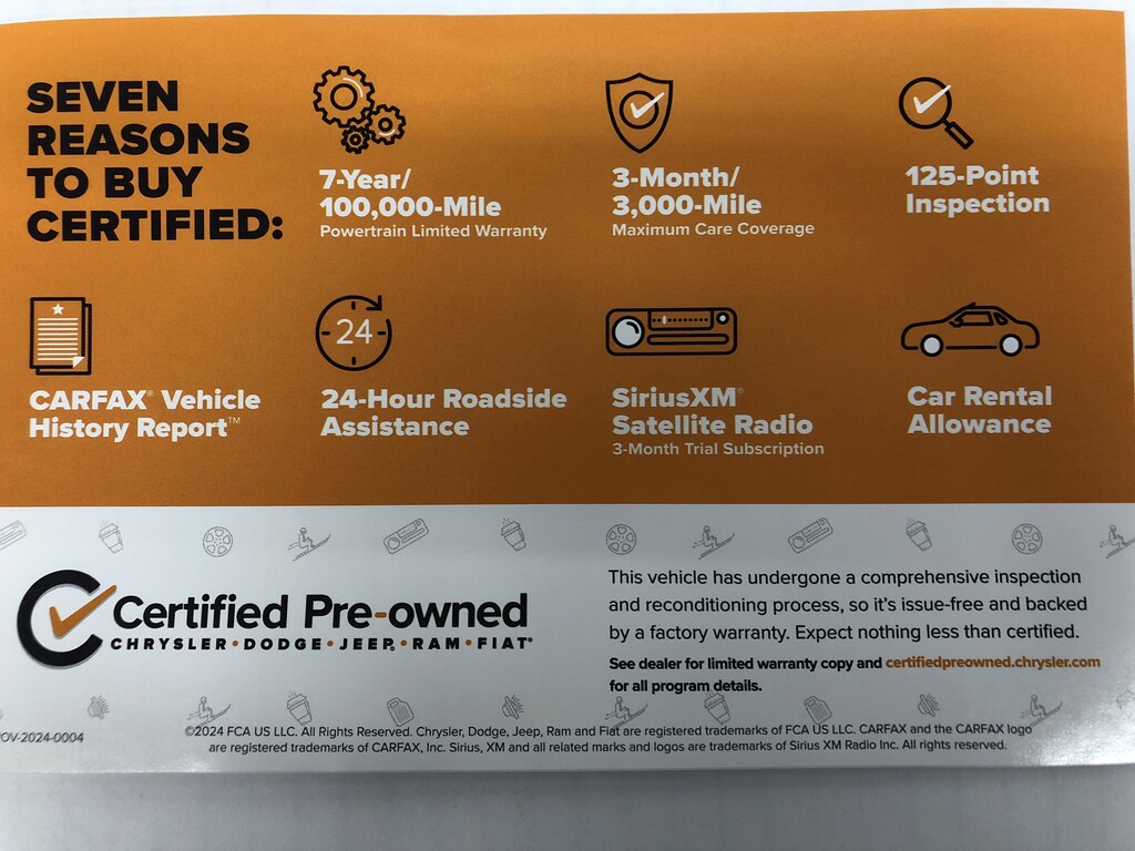 CERTIFIED PRE-OWNED!!! The vehicle underwent a 125-Point Inspection/Reconditioning process and comes with a 7-Year/100K mile factory powertrain warranty, along with a 3-month/3K mile factory Maximum Care Warranty! (If the vehicle is still under the original factory 3-year/36K mile warranty, that would run concurrent with the 3-mo/3K mile warranty). Also included at no extra cost is 24 Hour Roadside Assistance, Car Rental Allowance, and a 3-month SiriusXM Satellite Radio trial.