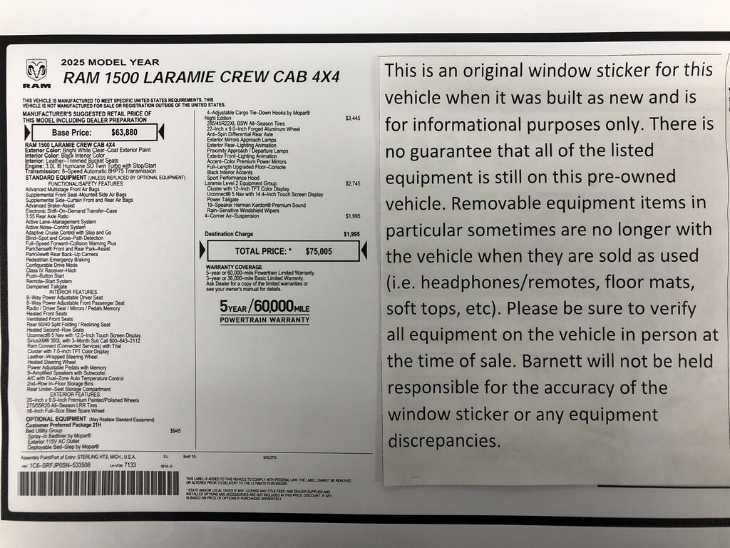• LARAMIE LEVEL 2 EQUIPMENT GROUP -inc: Rain Sensitive Windshield Wipers 14.4" Touchscreen Display Radio: Uconnect 5 Nav w/14.4" Display harman/kardon 19 Speaker Premium Sound Cluster 12" TFT Color Display Power Tailgate